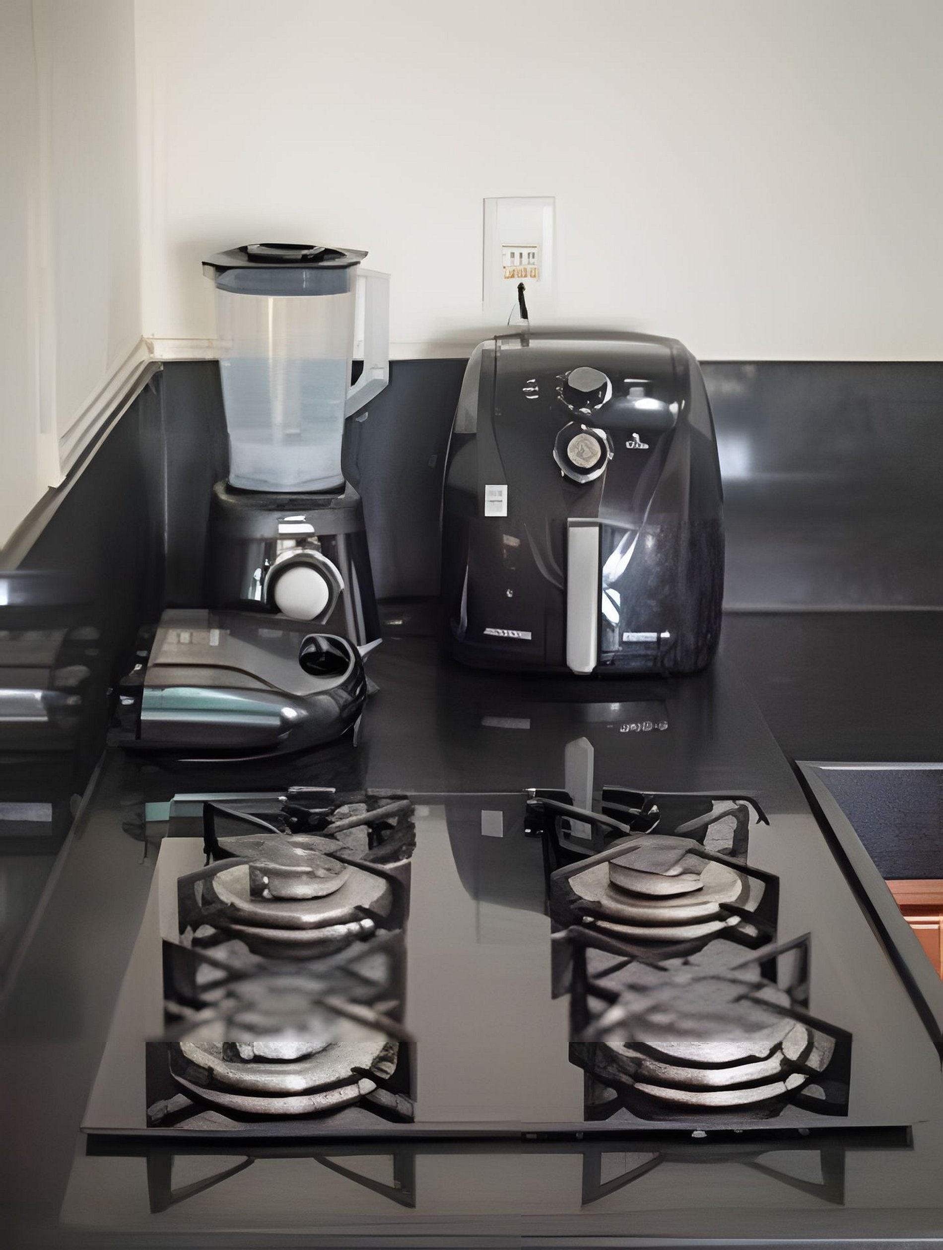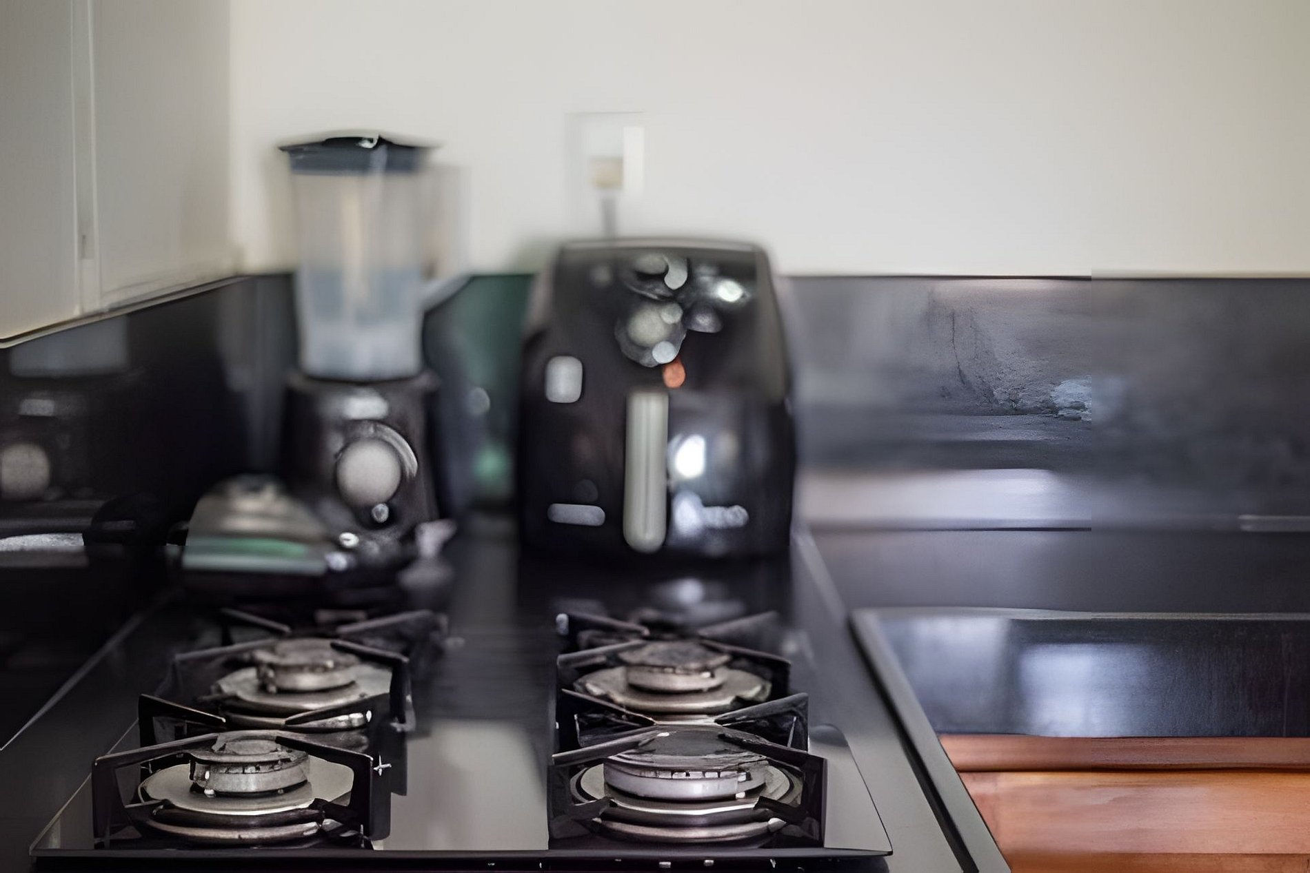 - Cozinha completa, com eletrodomésticos - sanduicheira; liquidificador e air fryer - e panelas; pratos; copos; xícaras; talheres e vasilhames.